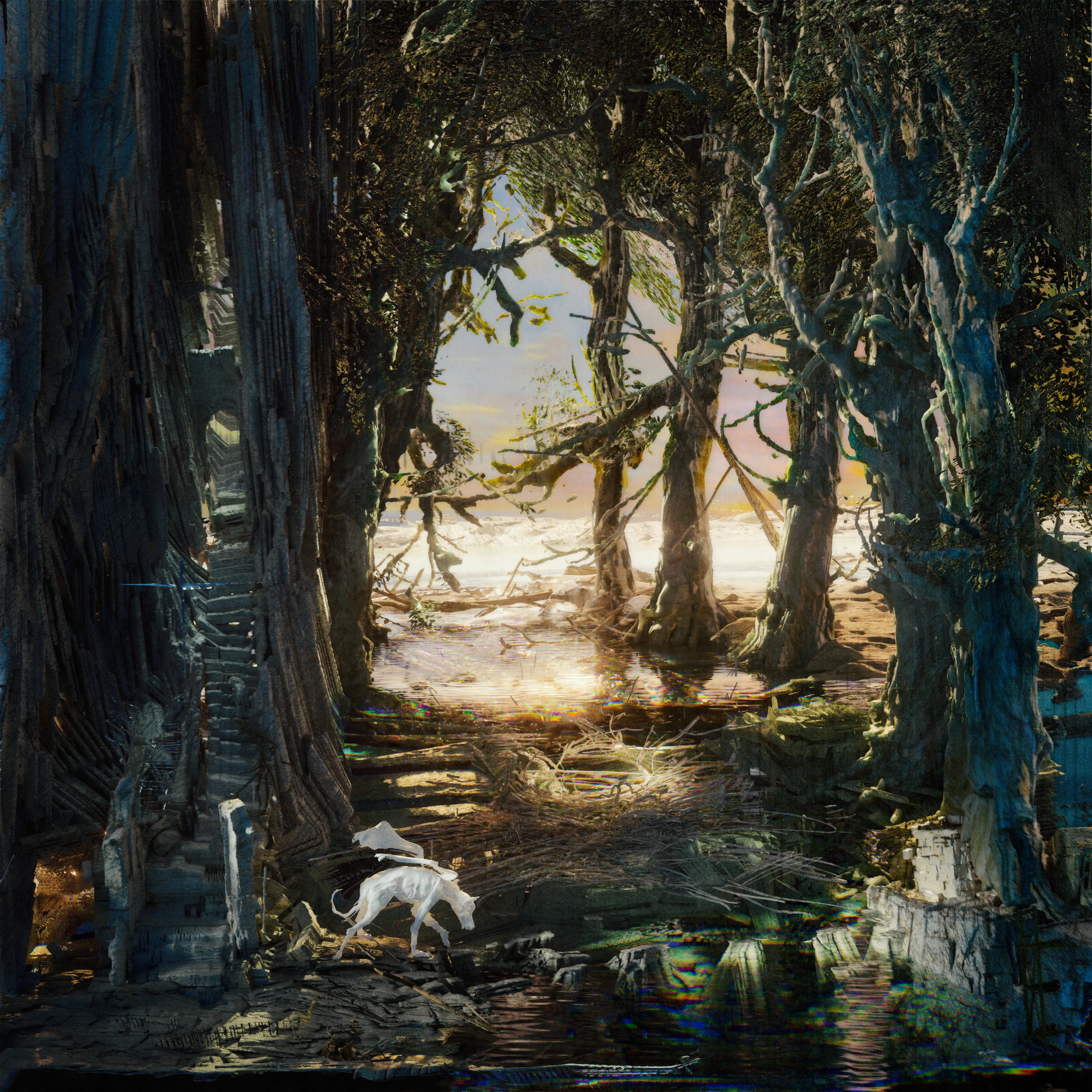 A fragment finds itself at the edge of a forest, looking out upon an infinite lake only separated by piles of sticks and trees.